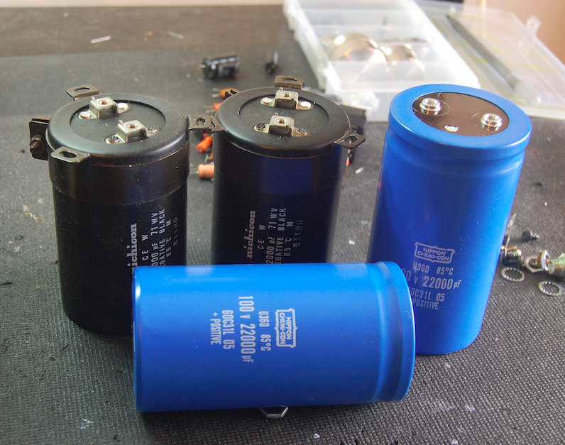 Both original Nichicon 22,000MFD capacitors were replaced with new, computer grade Nippon Chem Con 22,000MFD/100V filter capacitor.