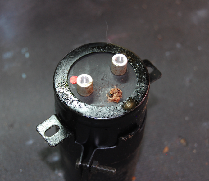 **NOTE THAT ONE OF THE LARGE 15,000MFD CAPS HAD ACTUALLY FAILED AND RUPTURED ITS MATERIAL VIA VENTING OUT THE BOTTOM LEAVING THE RAILS TO SUFFER MAJOR NOISE AND LAG