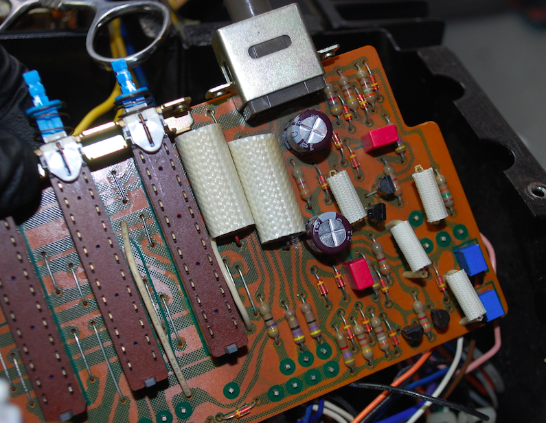 All of the axial diodes here were replaced with a general 4148 axial Vishay type, also replaced were remaining small signal devices with modern, low noise TO92 Fairchild devices. New precision, sealed Bourns potentiometers installed for calibration. Electrolytic were replaced with a low impedance Nichicon PW with an increase in operating voltages plus high grade WIMA polypropylene film capacitors.